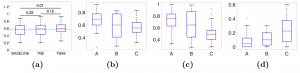 Metric Space Evaluation Fig. 2b compares the distributions of syndrome group sensitivities among syndromes assigned to the phenotypically distinctive categories A and B and the less distinctive category C. Those syndromes in categories A and B have higher median sensitivities than those in category C, with B showing slightly lower sensitivities than A. Fig. 2c and 2d compare the distributions of the proximity and overlap statistics respectively for syndromes within each category. These reflect the proximity and overlap of each syndrome to the controls. In general, as predicted, syndromes in categories A and B are more distant from and overlap less with, controls than those in category C. Graphically, this is shown in the t-SNE visualization (Fig. 3b) which shows syndromes in category A and B are more distant from controls than category C.