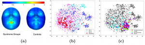 Fig. 3: (a) The heatmap of the reconstruction error per vertex. The overall error is 0.60 and 0.49 mm for syncdromic and control faces. (b) Syndromic and control individuals projected to the space. (c) RASopathies projected to the space.
