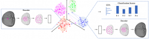 Related work on metric space learning of dysmorphism or syndrome identification based on facial data has mostly focused on 2D images or sparse 3D landmarks or has focused on a limited set of syndromic groups [1,4,5]. Here, we develop a ‘triplet-encoder’ to learn a non-linear low dimensional metric space for syndrome classification from dense 3D meshes of dysmorphic faces [6,11], coupled with spiral convolutional operators allowing us to learn directly from 3D data [2]. We further extend this model by attaching a decoder block to the network to enable facial reconstruction. This forces the metric space to learn facial similarities alongside between-group dissimilarities. In doing so, the resulting metric space not only sup-ports syndrome classification but also provides a comprehensive map of syndromic and general facial variation. We validate the metric space by measuring the performance of a simple linear classifier to assess the degree to which the metric space has learned discriminating variation among the syndromes. Furthermore, we validate properties of the metric space based on clinical knowledge of facial dymsorphisms and their interrelations among the groups. We generate faces at the center of syndrome clusters whereby we and the reader can assess if they display the known facial gestalt of certain disorders. Syndromes that are known to be facially distinctive should in general be distant from controls, whereas those with known overlap with controls should be closer. We assess whether syndromes that are phenotypically distinctive in general, and unique within the dataset, are relatively far from other syndromes and controls. We also assess whether related syndromes are relatively close together and overlap within the metric space.